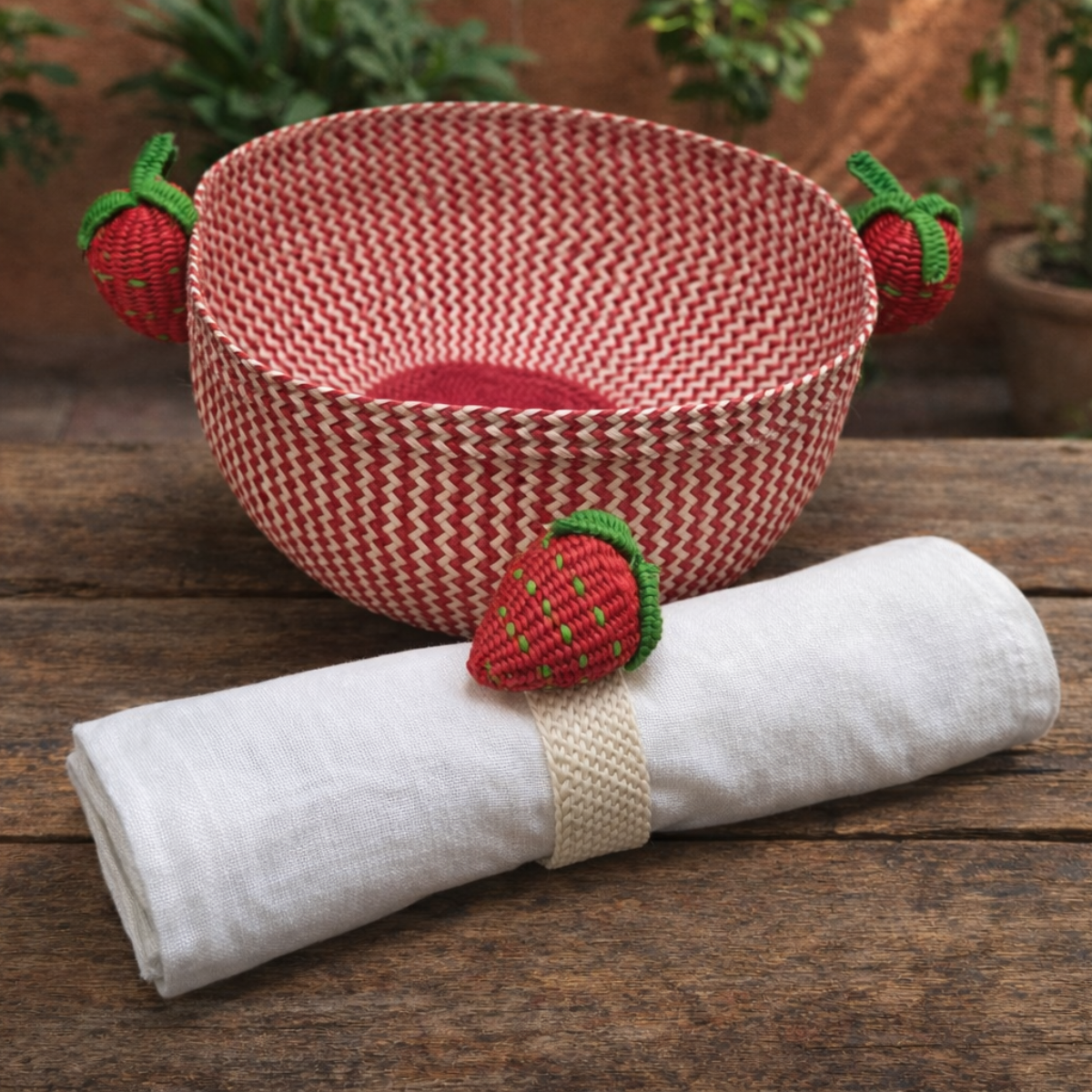 Anillo de servilleta en palma de iraca con diseño de fresa. Dulce y divertido.
