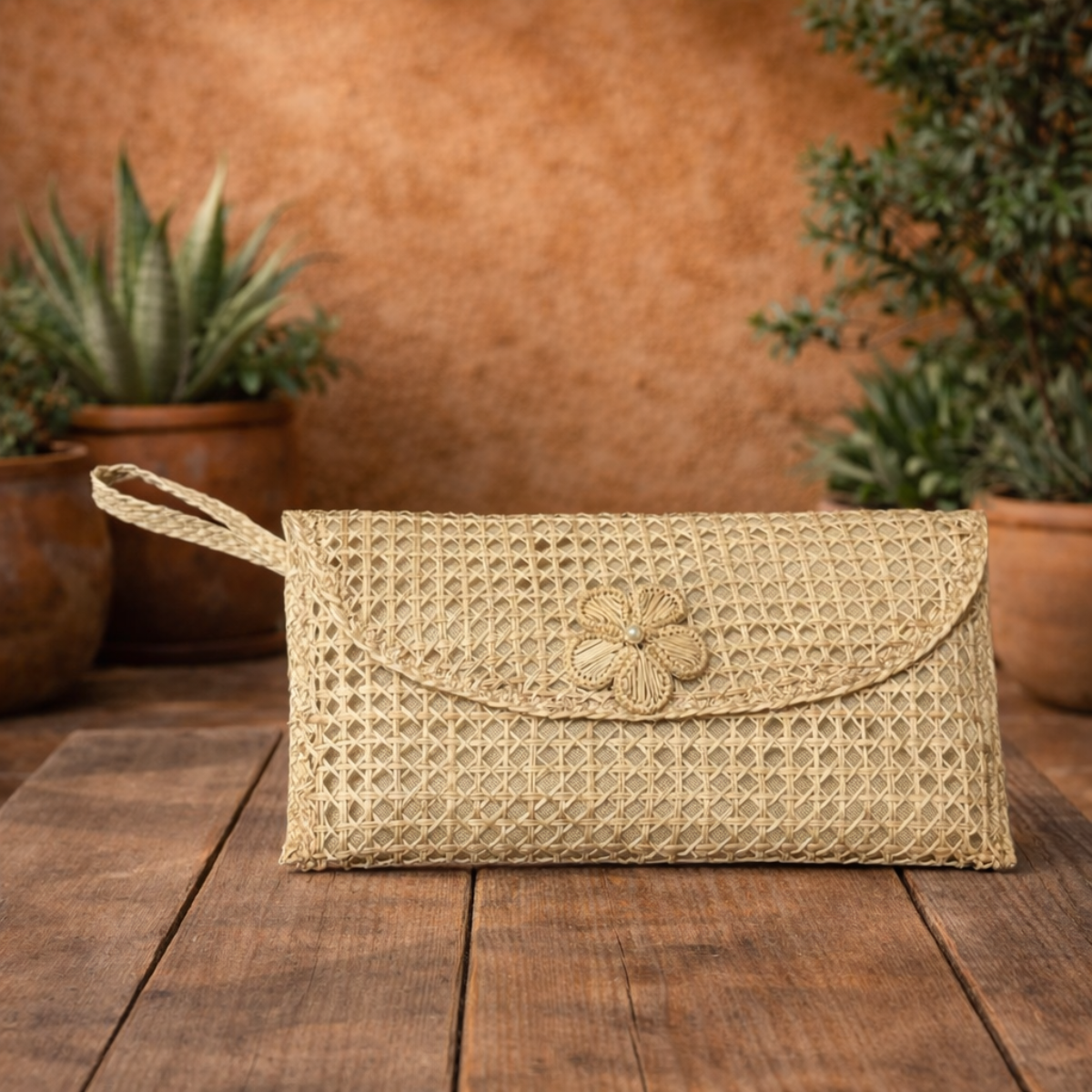 Un clutch tipo sobre, perfecto para salidas nocturnas o eventos formales. Está tejido a mano con **palma de iraca** de forma plana y elegante. Su diseño minimalista y su material natural lo convierten en un accesorio versátil para cualquier temporada.