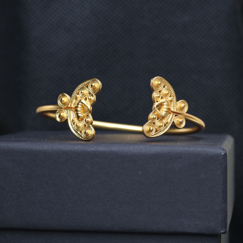 El Brazalete Nariguera Mariposa Tairona Baño de Oro 24 K es una pieza central que celebra el poder y la delicadeza de la iconografía precolombina. La **Nariguera Tairona** simboliza estatus y conexión espiritual, mientras que la **Mariposa** representa la transformación y la belleza.