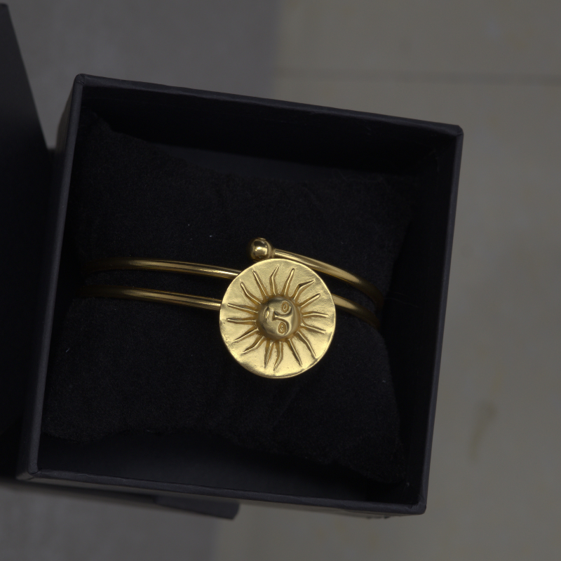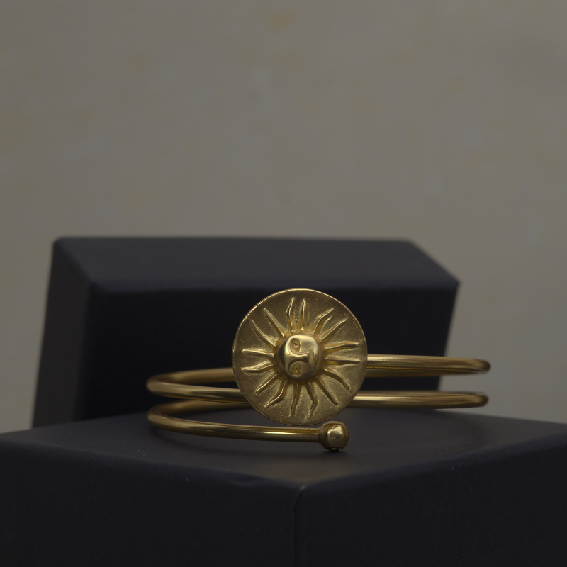 Este Brazalete Tres Aros Sol Baño de Oro 24 K es una pieza fundamental de nuestra colección de **lujo artesanal contemporáneo**[cite: 46]. Su diseño no es casual: los tres aros evocan ciclos y unidad, mientras que el Sol es un poderoso símbolo ancestral que conecta con la **energía y la vida**.
