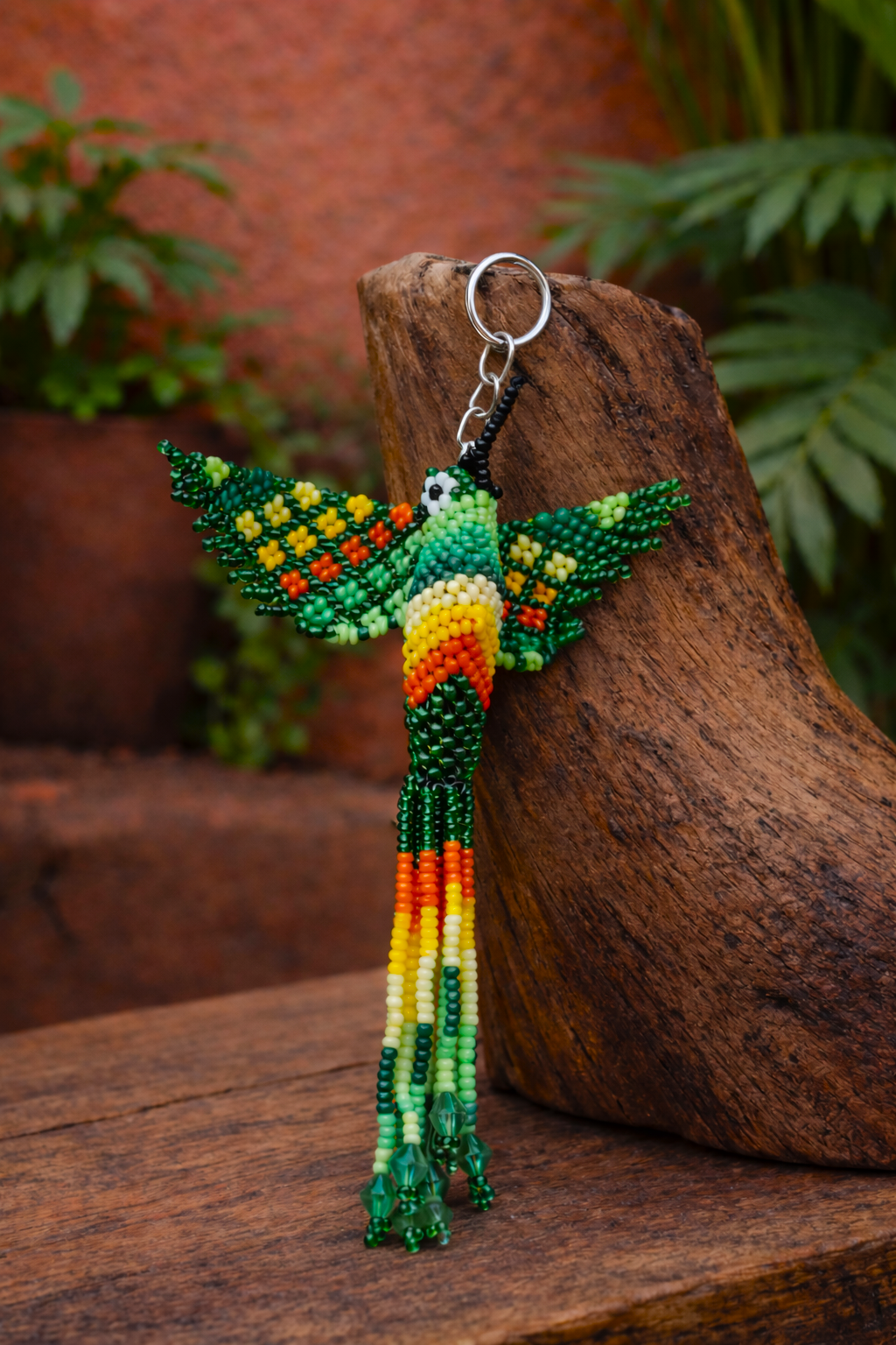 Elaborado con la técnica de la **mostacilla (chaquiras)** por artesanos expertos, cada llavero es un testimonio de la **paciencia, el detalle y la Calidad Humana** que definen nuestro trabajo. La riqueza del color y el diseño en 3D lo distinguen como un accesorio de **lujo artesanal contemporáneo**.