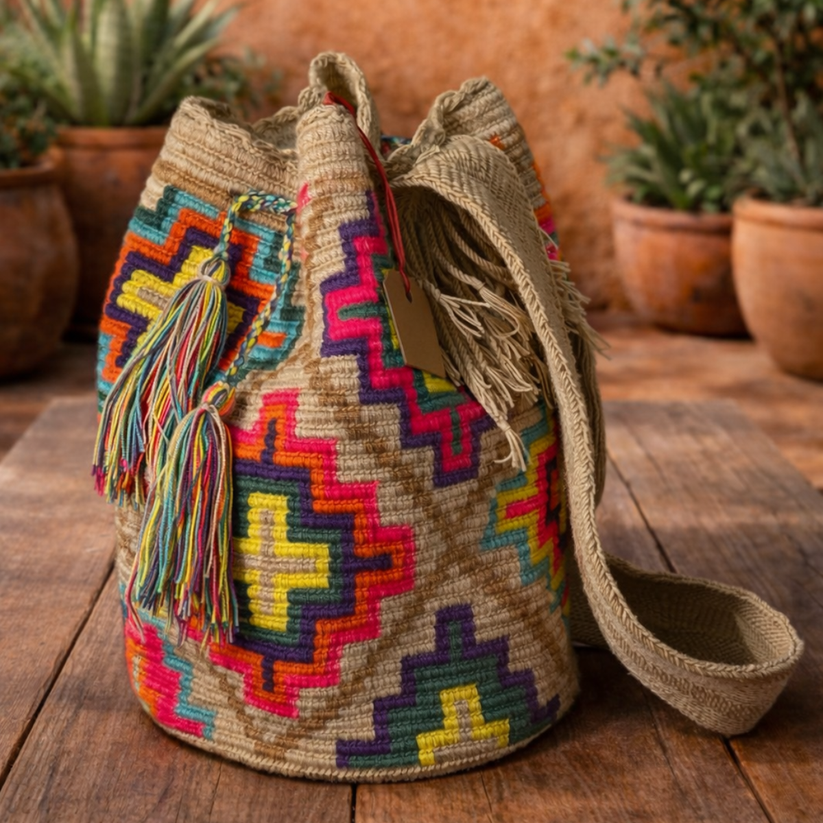- Material: Hilo de algodón de alta calidad o fibra sintética (según disponibilidad del Wayúu).