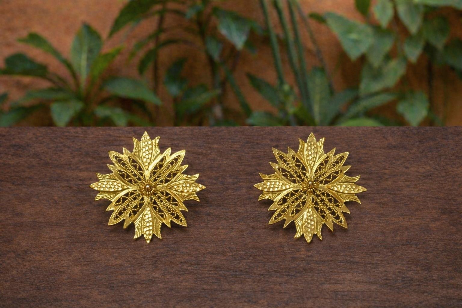 Este pendiente de estrella presenta un diseño de **filigrana cerrada**, lo que le da un aspecto más sólido y moderno comparado con la filigrana calada. Hecho en bronce con un rico **baño de oro de 24 quilates**, es una pieza statement que mantiene la ligereza y el detalle artesanal.