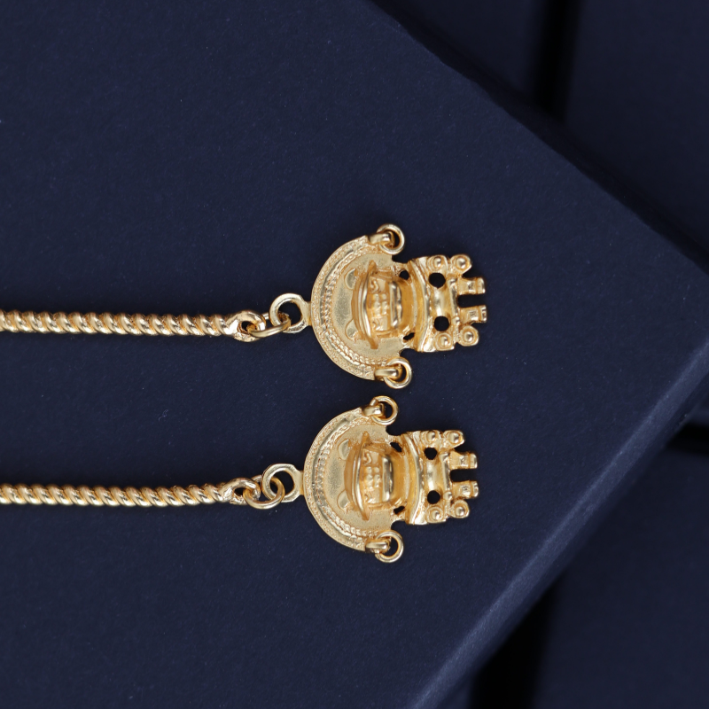 El formato largo no solo evoca la majestuosidad ceremonial, sino que garantiza una joya de **alta calidad** y gran presencia. El espléndido **Baño de Oro de 24 quilates** asegura una pieza **exclusiva**, cuyo brillo y **autenticidad** se mantienen en el tiempo.