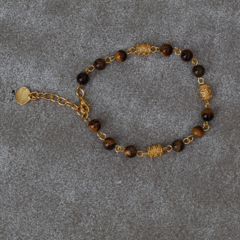 La Pulsera Piedra Café Tigre Peltre Baño de Oro 24 K es una joya que encarna la **esencia mística y sofisticada** de Waira. Esta pieza exclusiva combina la **Piedra Ojo de Tigre**, famosa por sus tonalidades cafés y doradas que evocan fuerza y protección, con el detalle artesanal del **peltre** trabajado por manos maestras.