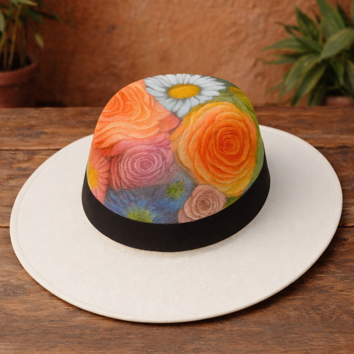 La **exclusividad** de esta pieza reside en su **decoración floral** aplicada a mano. Las flores, creadas artesanalmente, añaden un toque **romántico y femenino**, elevando el sombrero de simple accesorio a una pieza de **lujo artesanal contemporáneo**. El ala ancha no solo ofrece máxima protección solar, sino que también aporta un aire de misterio y glamour, muy propio del espíritu **Waira**.